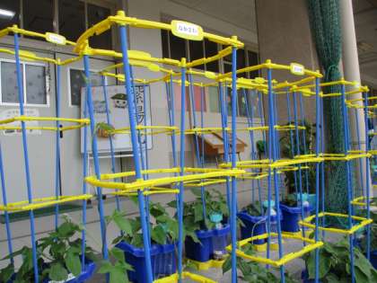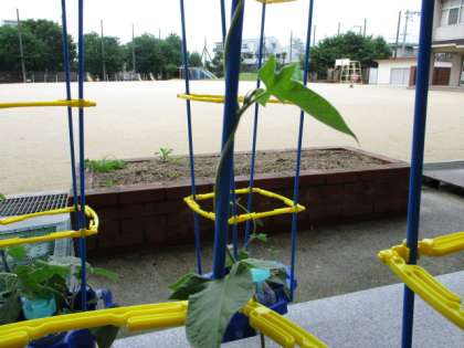 「しちゅう」をつけてもらったアサガオちゃんは早速、蔓を伸ばし始めました。
