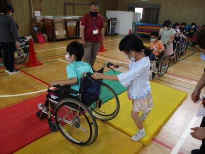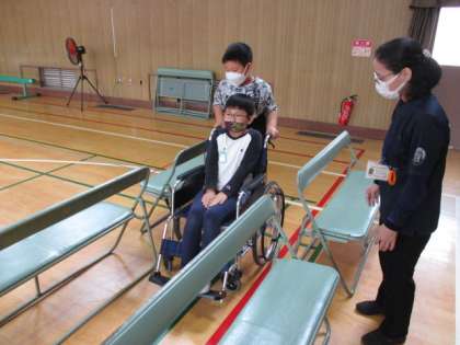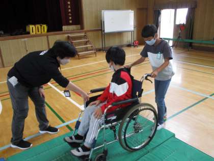 阿倍野区社会福祉協議会のみなさんに来ていただき、車いすの使い方や介助の仕方について学びました。