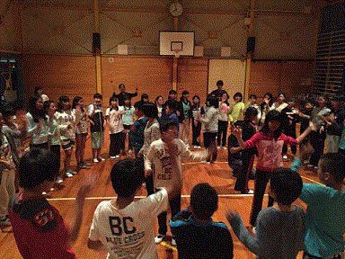 キャンプファイヤー係や指導員の先生方が準備していたスタンツをしたり、みんなで大きな声で歌ったりして盛り上がりました。ファイヤーを囲んでできませんでしたが、みんなの心がひとつになった行事となりました。