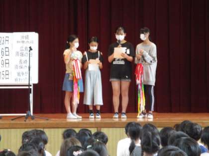 校長先生のお話のあと、6年生の代表から、折り鶴へのお礼と修学旅行で献納するという告知がありました。