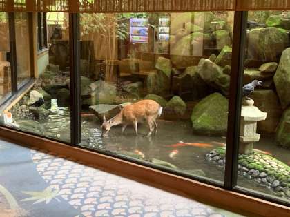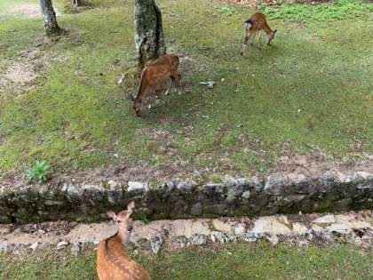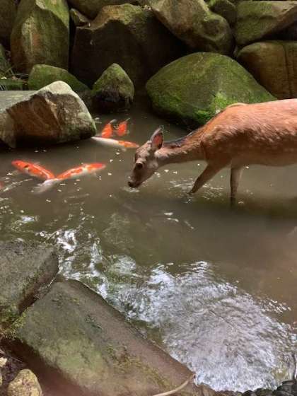 宿舎の池では鯉と鹿とカラスたちとの間で餌の争奪戦が繰り広げられていました。