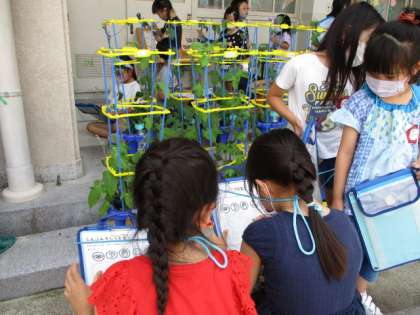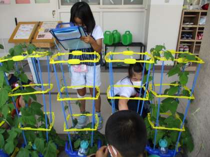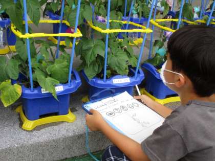 廊下がにぎやかだったので見に行くと、「新聞記者カード」を携えた1年生たちが、アサガオの観察記録をかいていました。