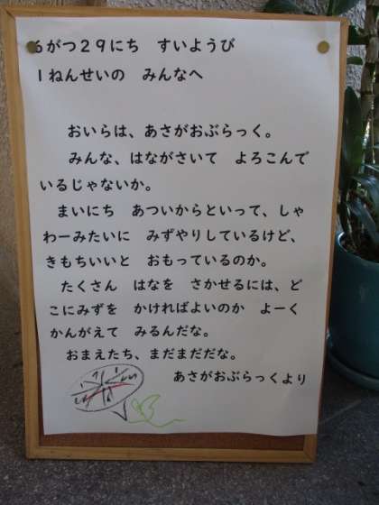 毎朝アサガオへの水やりを欠かさない1年生のみんなに、アサガオブラックから手紙が届きました。