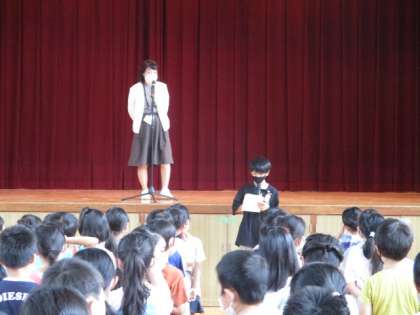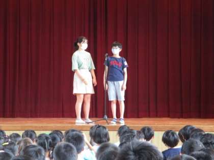 校長先生の西瓜にまつわるお話、運動委員会、保健委員会、美化委員会からのミナミンピック週間、なかよしぴかぴか週間についての連絡などがありました。