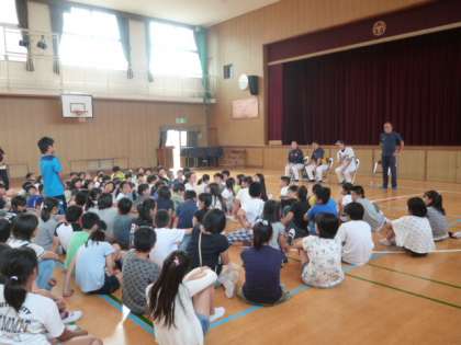 5・6年生のキャリア教育で、「オリックス・バファローズ」の方々に来ていただきました。元プロ野球選手やトレーナーの人たちにその世界での厳しい競争を通じて経験してきたことを話してもらいました。