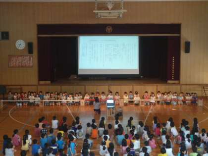 ふれあい教育で学習した阿部野神社の夏祭りの太鼓演奏を全校児童の前で発表しました。たくさんの人数で演奏したので、大迫力でした。