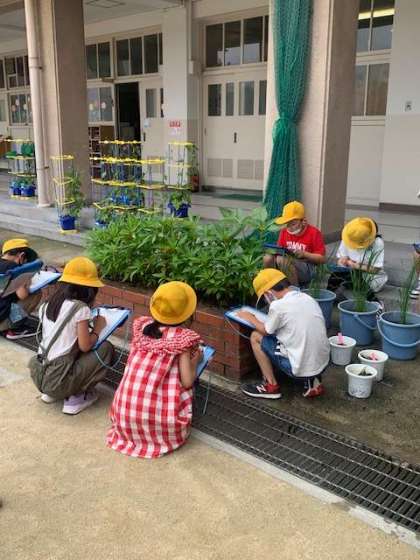 3年生が理科の学習で、ひまわり、ホウセンカ、マリーゴールドの観察をしていました。