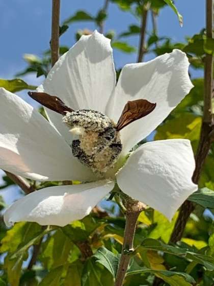 クマバチは花粉まみれになりながら花芯にしがみついています。
