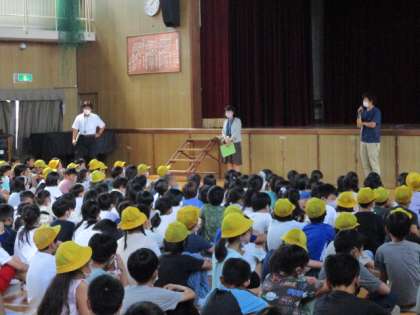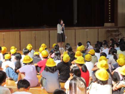 一次避難として全校で講堂に集合し、担当の先生と校長先生から避難時の注意点や、大地震が発生した際の津波についてお話を聞きました。