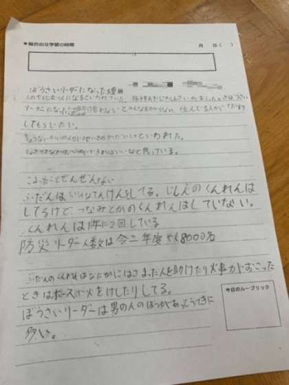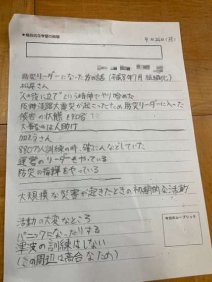 防災リーダーさんからお話を伺った後の子どもたちのメモをちょっと覗いてみました。