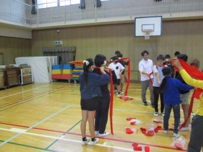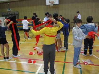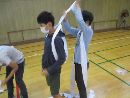 1人ではなかなか難しいので、お互いに協力し合いながらタスキがけを完成させました。