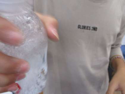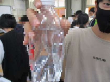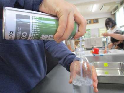 空のペットボトルに半分ほど水を入れ、ボトルの中に二酸化炭素ガスを充填し、ふたをしたらよーく振ります。