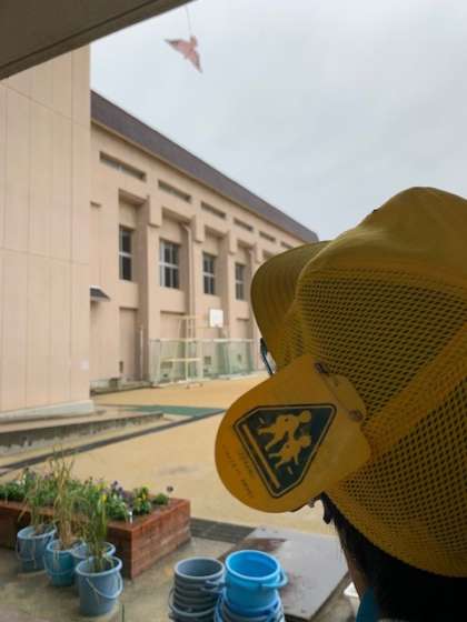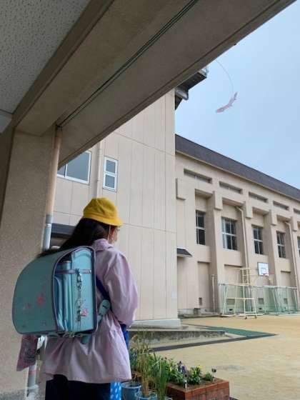 登校してきた子どもたちが足を止め、講堂の上の方を向いています。