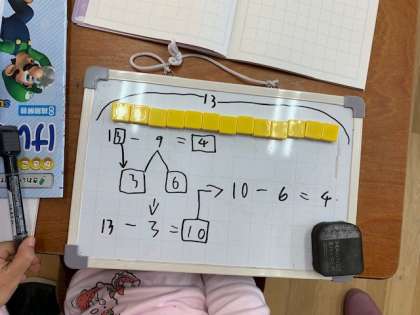 13−9の計算をどのようにすればできるのかについて、ブロックを使いながら自分なりの方法で考えました。
