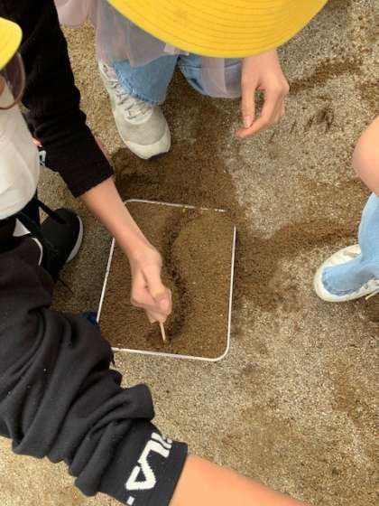 流れる水のはたらきを学んだあと、人工的に小さい川をつくり、100mLの水を流したときと、200mLの水を流したときとで、川の様子にちがいが見られるかどうかを確かめてみました。