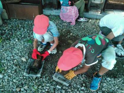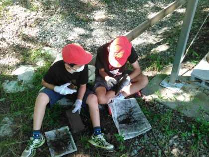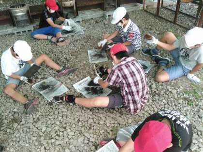 避難訓練のあと、焼き板を1枚ずつもらい、光沢がでるまで磨きました。明日の午後の活動時に、ハチ高原での思い出を焼き板に絵付けをする予定です。どんな作品に仕上がるのか楽しみです。