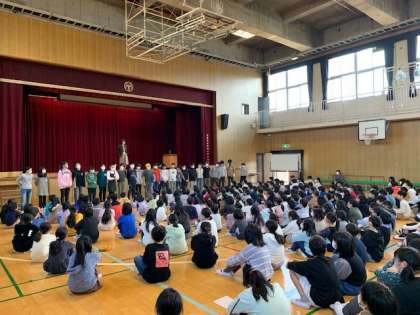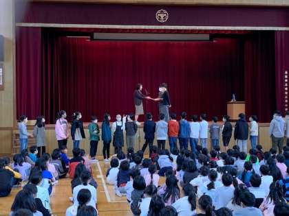今日の朝会では、昨日の阿倍野区小学生親善ドッジボール大会の表彰がありました。