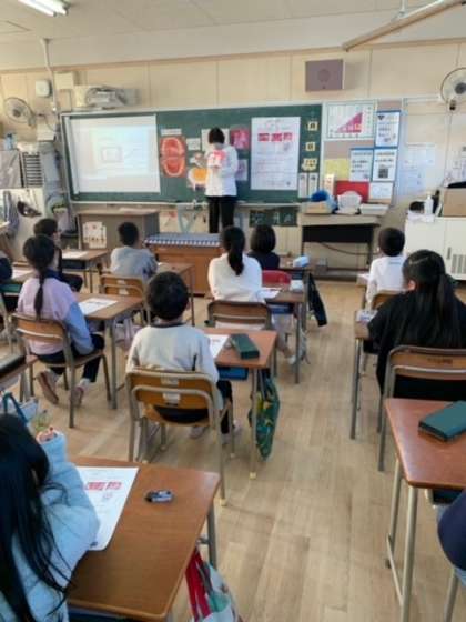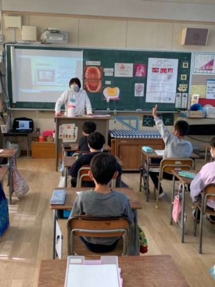 正しい歯みがきの仕方を歯科衛生士の先生に教えてもらった2年生。