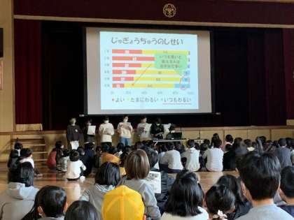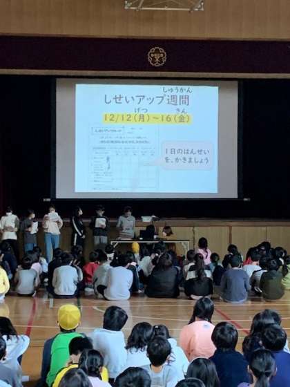 よい姿勢を保つことの大切さについての説明や、姿勢をよくする簡単ストレッチの紹介、また次週の「姿勢アップ週間」の告知がありました。