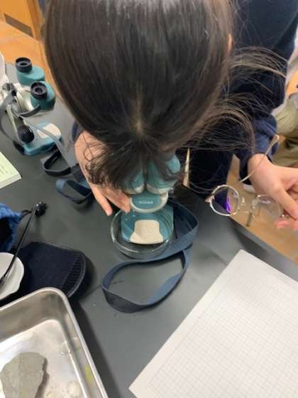 6年生の理科で火山灰を顕微鏡で観察しました。