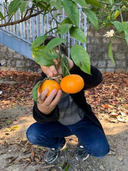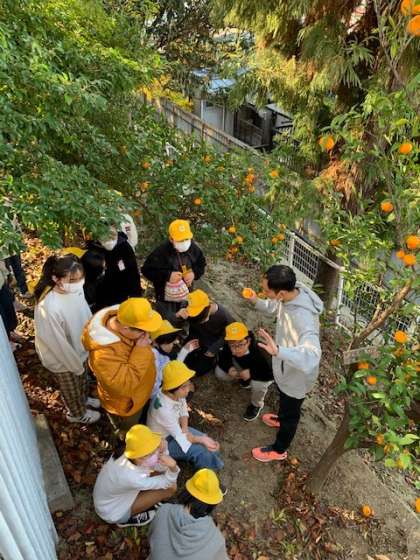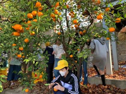 そろそろ狩りいれ時と、15分休みに恒例の「ミカン狩り」を行いました。