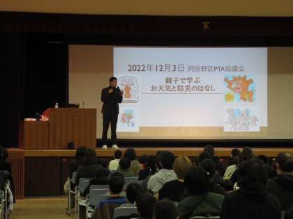 この研修会は、本校のPTA役員の皆様の尽力により、気象予報士の蓬莱大介様を講師として招聘し、開催されたものです。演題は、「親子で学ぶお天気と防災の話」、実験ありクイズあり、笑いありのとっても勉強になる楽しいお話でした。本校からも、たくさんの方々が、親子で参加してくださいました。研修会を担当して頂いた、会長や役員の皆様、お疲れ様でした。ありがとうございました。(3枚目の写真は、ご本人の許可を頂いたものです。)