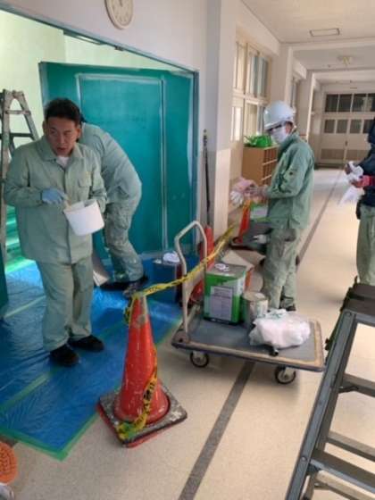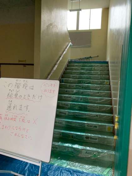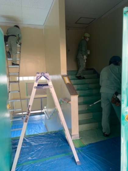 管理作業員さんたちのチームワークの下、昨日からB棟階段壁のペンキ塗りが始まりました。