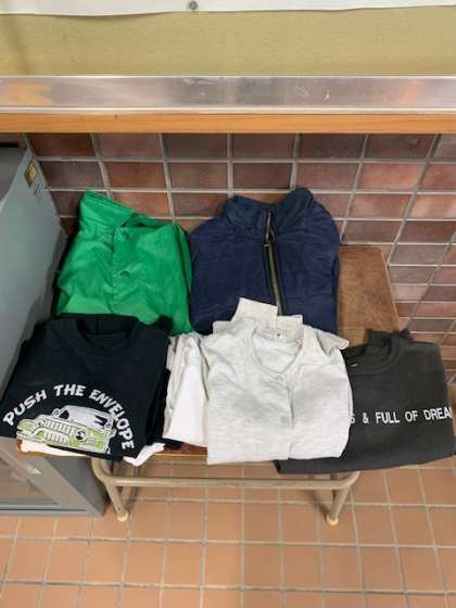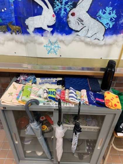 現在、学校の玄関に校内で拾得した落とし物、忘れ物を並べています。