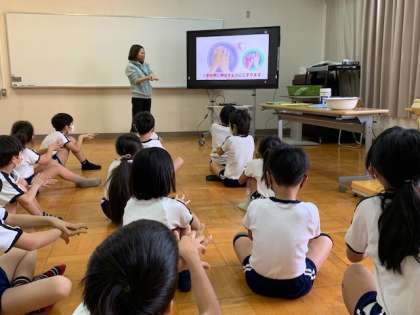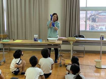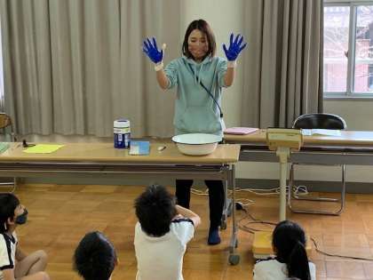 保健の先生が青絵具を石鹼に見立てて、手洗いの指導をしている場面です。
