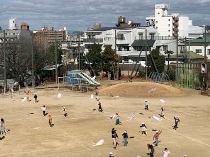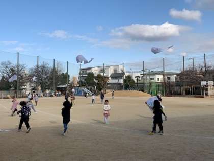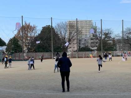 運動場で歓声が上がっているので見に行くと、1年生の手作り凧が揚がっていました。