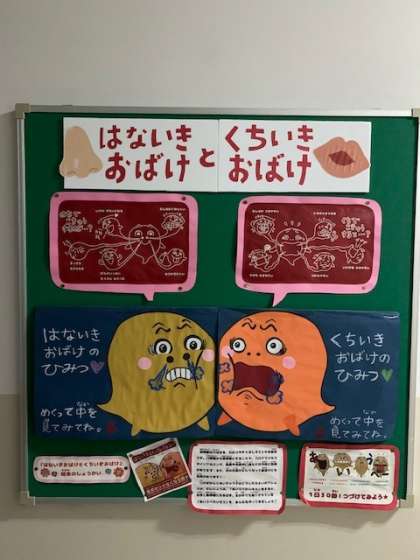 1月の保健室前の掲示「はないきおばけ」と「くちいきおばけ」です。