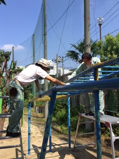 今日から2日間、「うんてい」のペンキ塗り作業が始まりました。晴明丘小学校の管理作業員と本校の管理作業員との合同作業です。青色から黄色に塗り替えられます。猛暑の中での作業は大変ですが、丁寧に作業をしていただいています。2学期には、色鮮やかに塗り替えられた「うんてい」で元気よく遊んでほしいと思います。