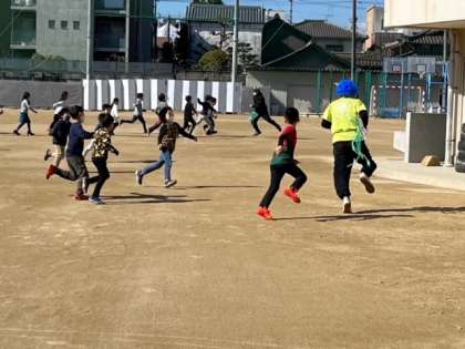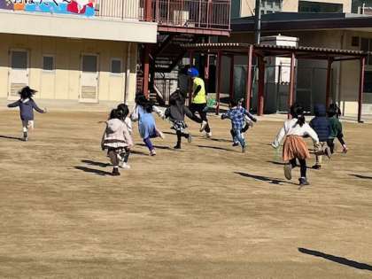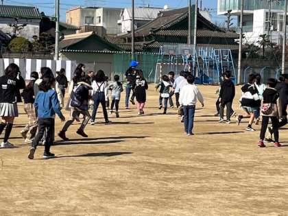 鬼のしっぽのひもをとったらお菓子がもらえます。本校、副会長さんも全速力で逃げていましたが、みるみるうちにたくさんの子ども達に囲まれていました。