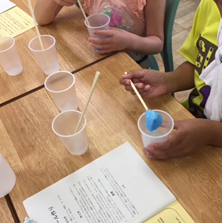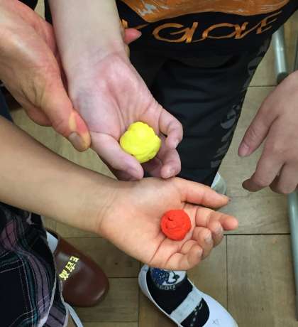 せんたくのりに食塩と水、ほうしゃを少量入れてよくかき混ぜます。水気を取りながら形を整えていきます。