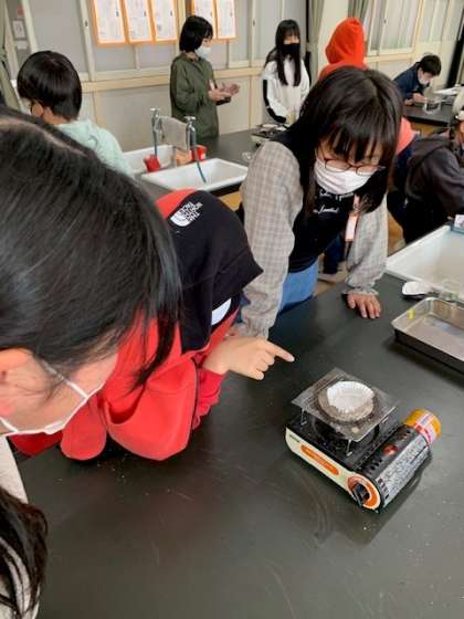 今日は、食塩水とミョウバン水を火にかけ、水分を蒸発させると、溶けているものが出てくるかどうかを確かめました。
