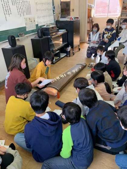 琴の楽譜は、縦に書かれており、数字は弦の番号になっていました。4年生のみんなの習得の速さには、驚きました。次々に手を挙げて、子ども達が奏でる音色の素晴らしさは、伝統楽器の魅力を存分に感じさせるものでした。