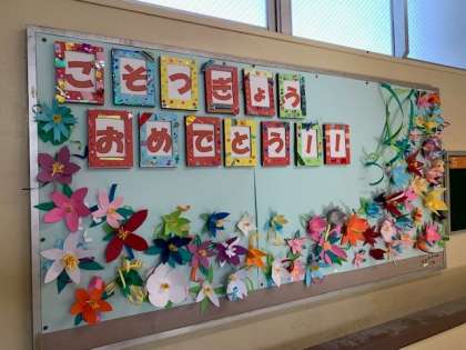 階段踊り場の掲示は、いまどこを見ても卒業お祝いメッセージで埋め尽くされています。