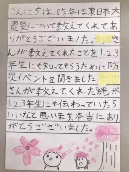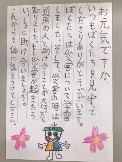 昨年ゲストティーチャーとして来校していただいた、東日本大震災のボランティアをされた方、区役所の方、防災リーダーの方と、日頃お世話になっている見守り隊の方々にお手紙を書きました。