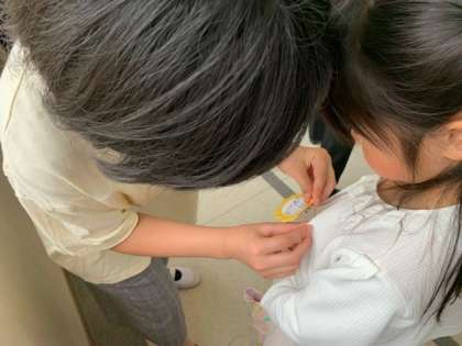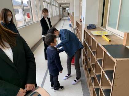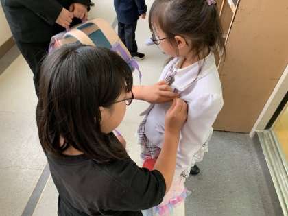 6年生に教室まで誘導された1年生は、6年生から新しい名札をつけてもらいました。