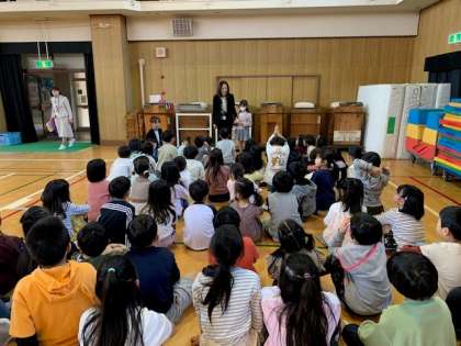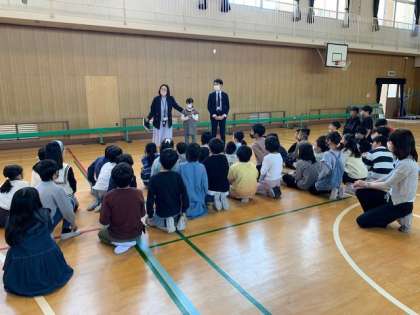 式後には、2年生と4年生が講堂で転入生の紹介と、クラス分けを行いました。
