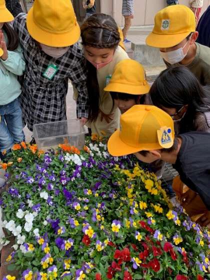 昼休み、花壇にたくさんの3年生の子どもたち。