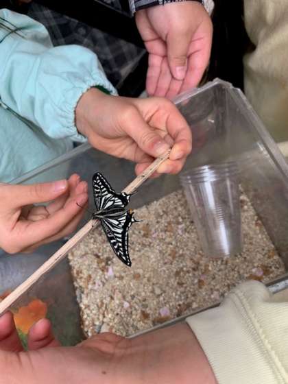 朝、たまたま羽化寸前のアゲハを見つけたので、子どもたちに託しました。