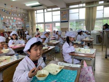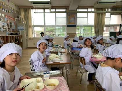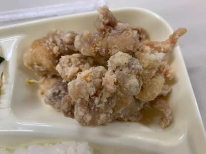 1年生の教室を覗きに行くと、からあげを優先して食べる子どもたちが多数いました。