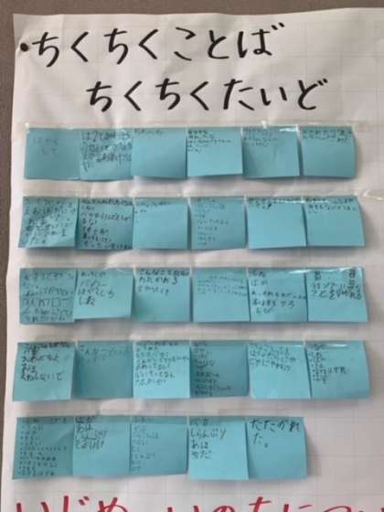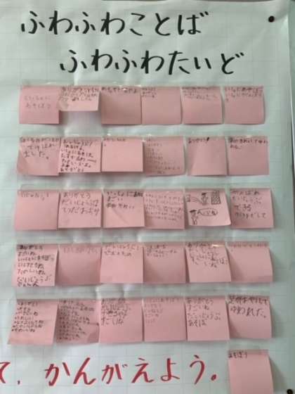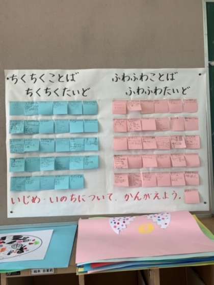 先日のいじめ(いのち)について考える日に、校長先生が話された「ふわふわ言葉(ふわふわ態度)」「ちくちく言葉(ちくちく態度)」について、子どもたちなりに考えたことが掲示されています。