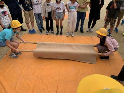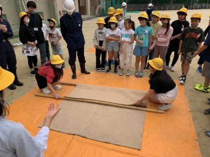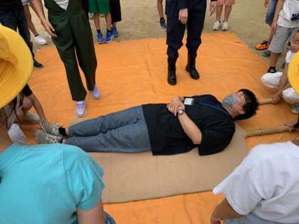 5年生は簡易担架作りと搬送法の実習を行いました。