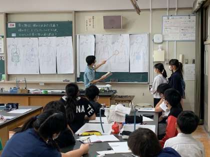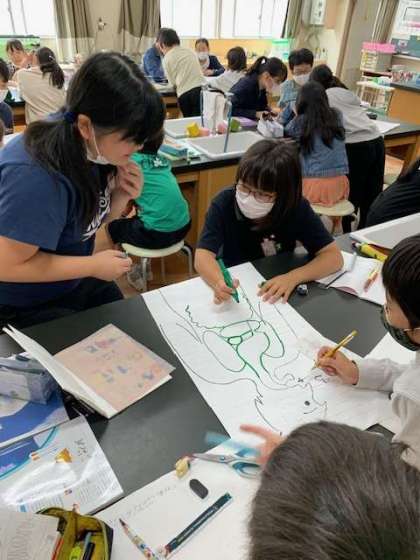 ヒトや動物の体の学習の導入として、体内の消化管を想像して描きました。