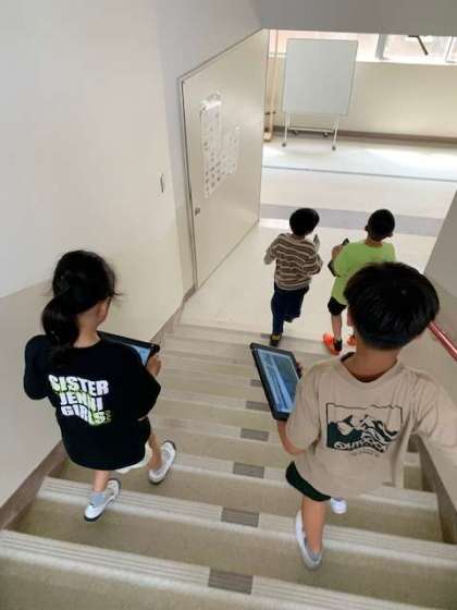 5時間目、3年生がタブレットを片手に、校内をウロウロ。