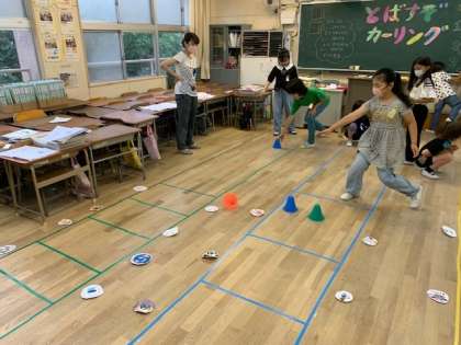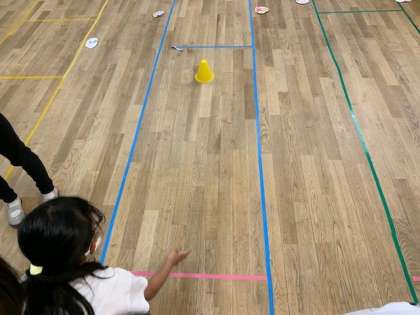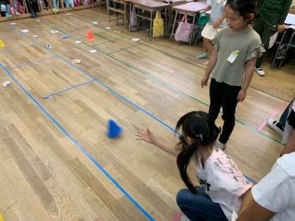三角コーンを滑らせて、狙ったところに見事止めれば高得点です!