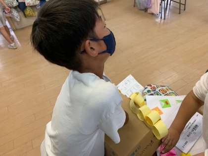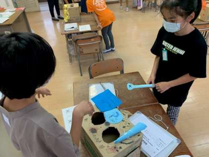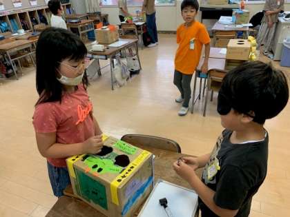 指の触覚を頼りに、箱の中に入っているものを当てます。
