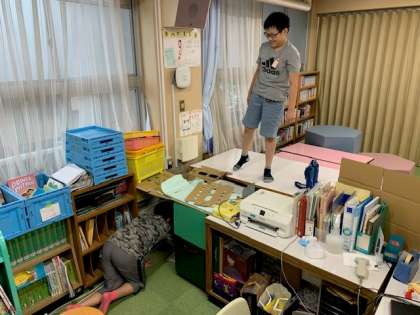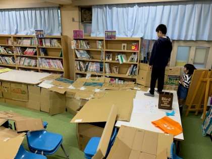 机、段ボール、椅子を見事に組み合わせて作った巨大迷路。